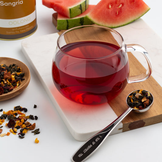 Our Sandia Sangria Oolong is a fruity sangria-inspired blend with hints of watermelon, lemon, and orange. This tea is named after New Mexico's Sandia mountains—sandia means "watermelon" in Spanish, which is what these mountains are said to look like when they glow red at sunset.