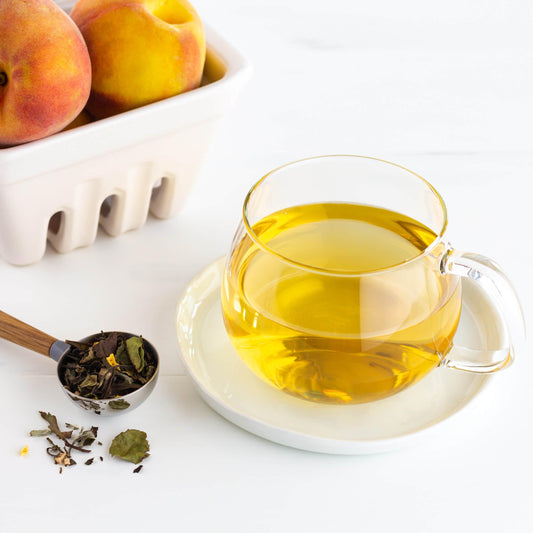 Peach Rooibos blends green rooibos and red rooibos with peach bits, blackberry leaves, and calendula petals for a juicy, fruity tea that's bursting with flavor.