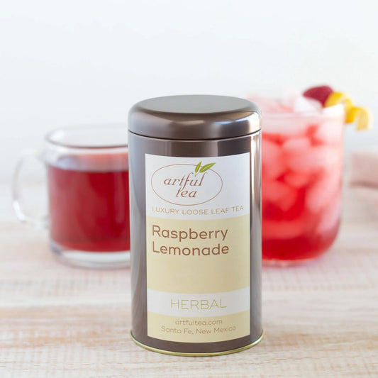 Summer in a cup! Raspberry Lemonade blends raspberry, apple, hibiscus, lemon peel, rosehip peels, chamomile, and strawberry leaves for a fruity, tart tea that's delicious hot and excellent iced.