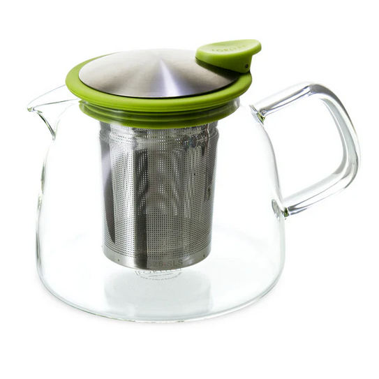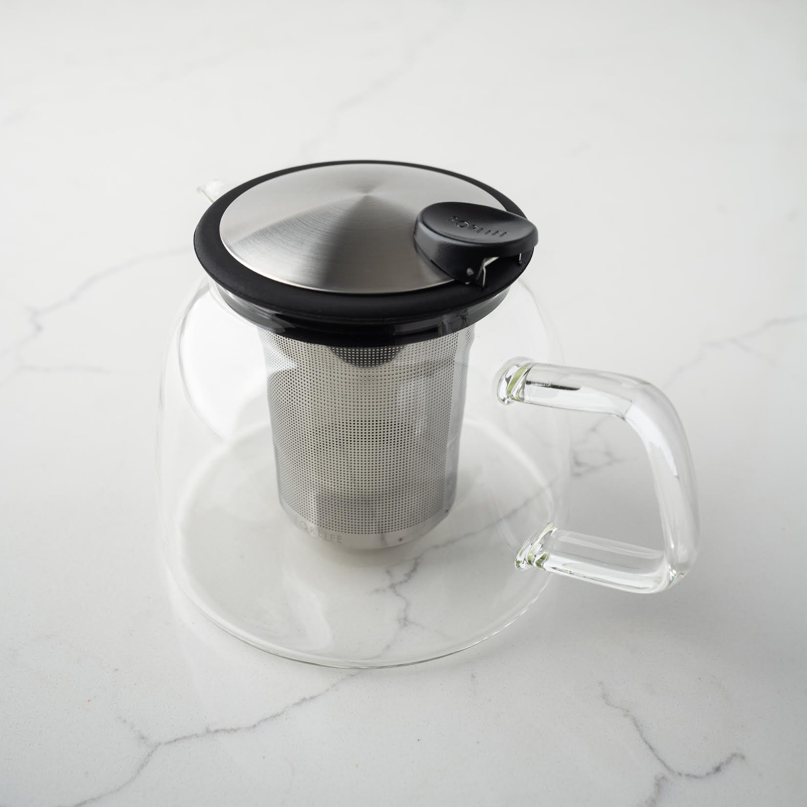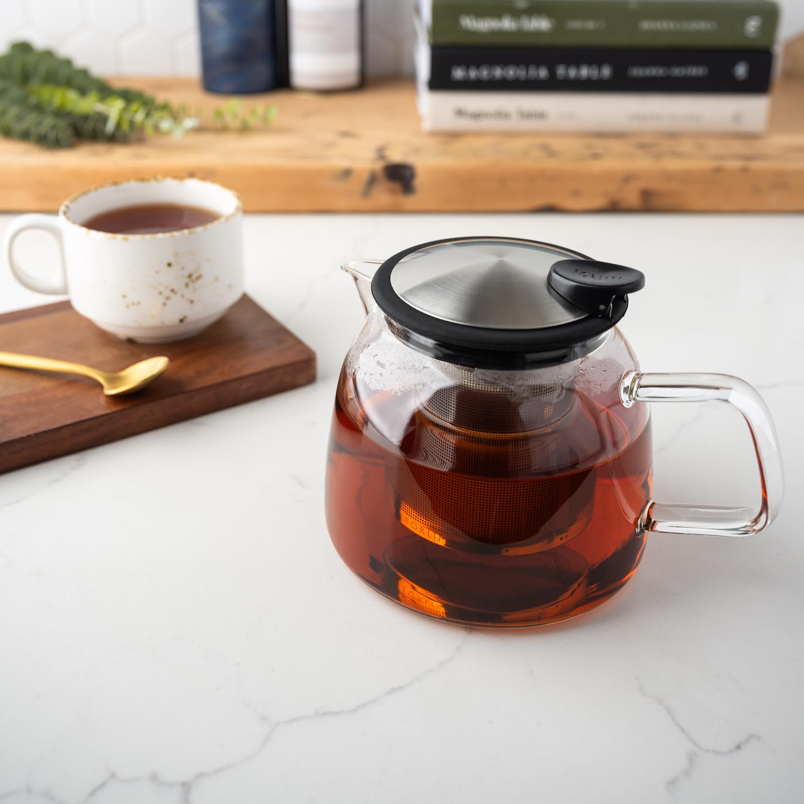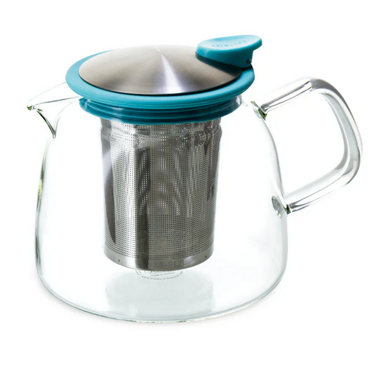 This glass teapot features lead-free borosilicate glass and a removable fine mesh stainless steel infuser basket for easy brewing. We've used these teapots daily in our shop for years—they truly stand the test of time! Each pot holds 24 ounces of tea and measures approximately 6.5 by 4.8 by 4.5 inches. Dishwasher safe.