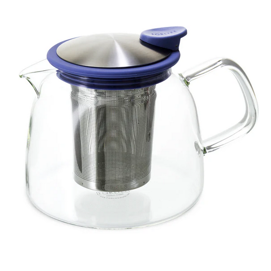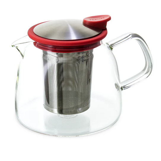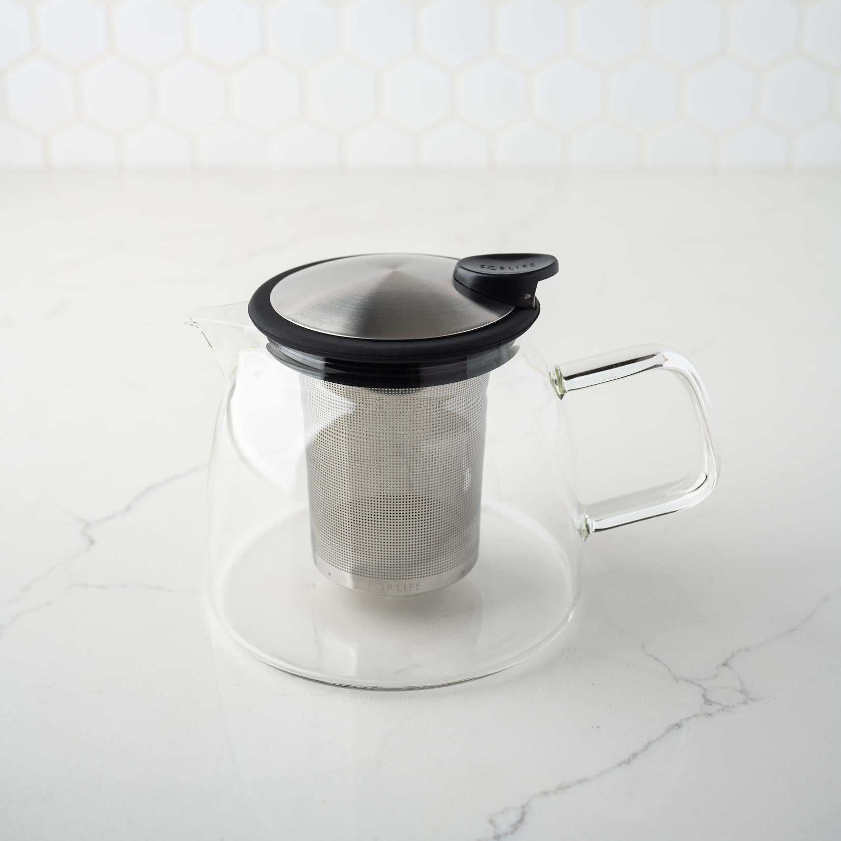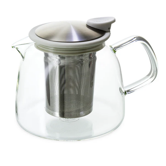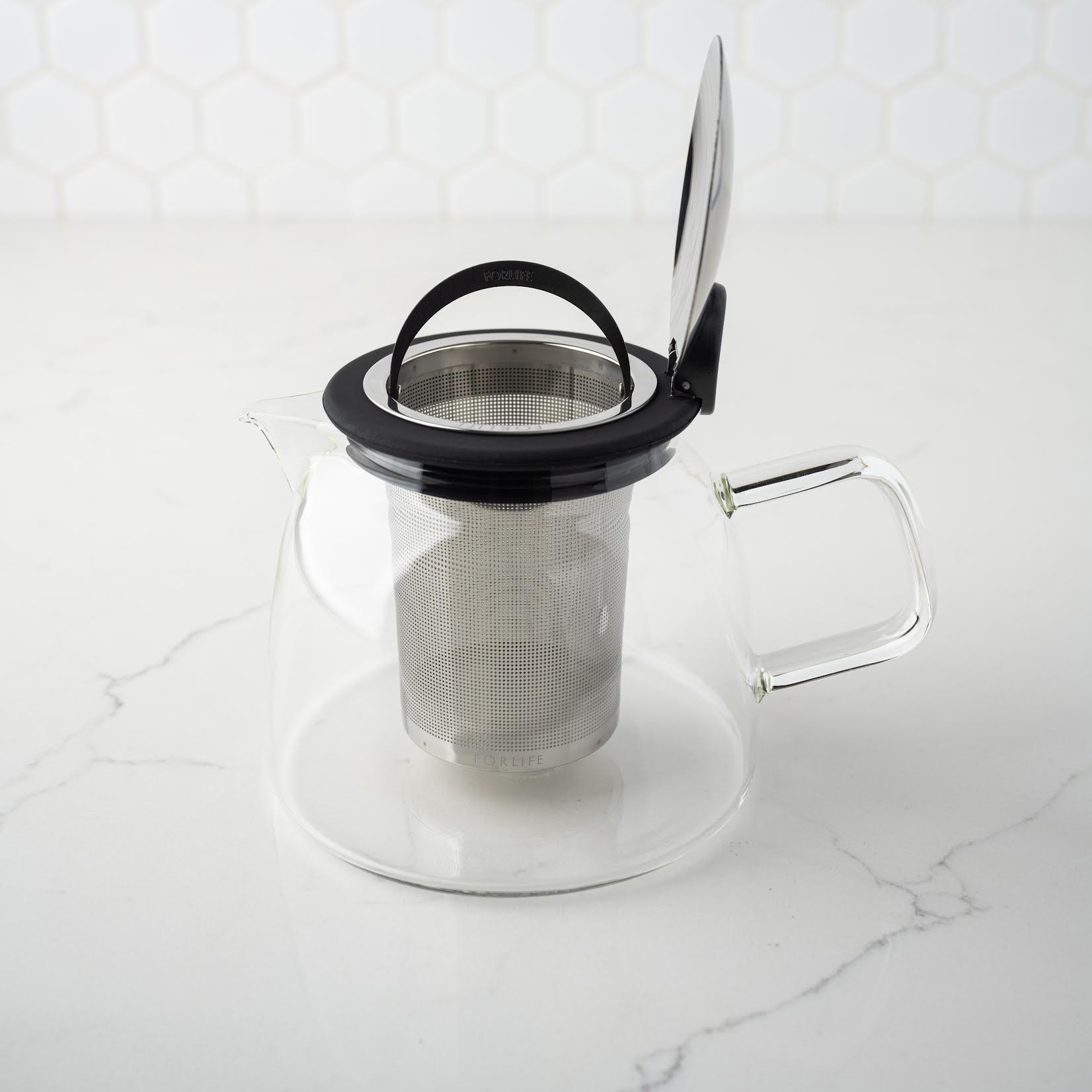 This glass teapot features lead-free borosilicate glass and a removable fine mesh stainless steel infuser basket for easy brewing. We've used these teapots daily in our shop for years—they truly stand the test of time! Each pot holds 24 ounces of tea and measures approximately 6.5 by 4.8 by 4.5 inches. Dishwasher safe.
