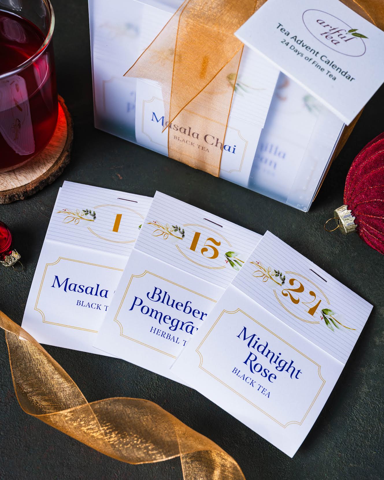 All of the teas included in our Tea Advent Calendar are the same loose leaf teas we sell in our store and online. To make it extra-simple to prepare, we’ve spooned two teaspoons of loose leaf tea leaves into a paper tea filter—one for each day. Just place the tea filter in a cup or mug, infuse with hot water, and enjoy!